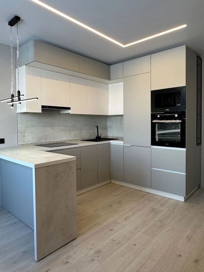 Встроенная кухня с бытовой техникой — это аккуратный внешний вид и удобство в повседневном использовании. Холодильник, посудомоечная машина, духовой шкаф и варочная панель интегрируются в кухонный гарнитур и не нарушают общий дизайн. Вся техника располагается логично и эргономично.