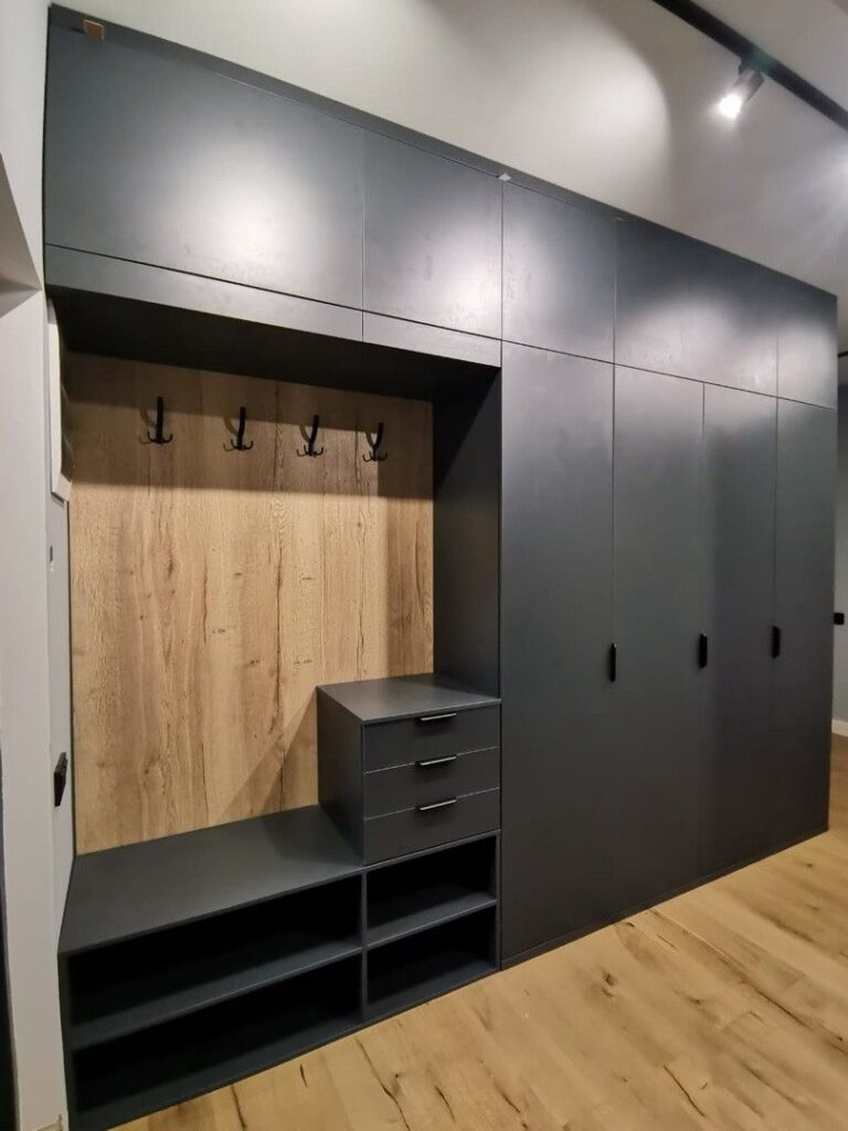 - Фурнитура: Blum, Hettich, Boyard — доводчики, направляющие полного выдвижения, встроенные механизмы для корзин, вешалок и обувниц.