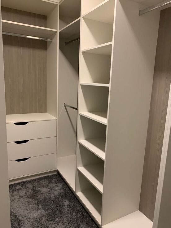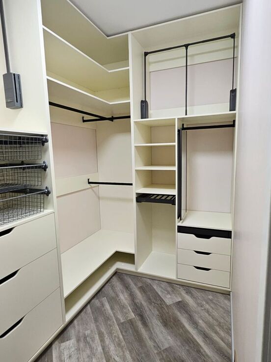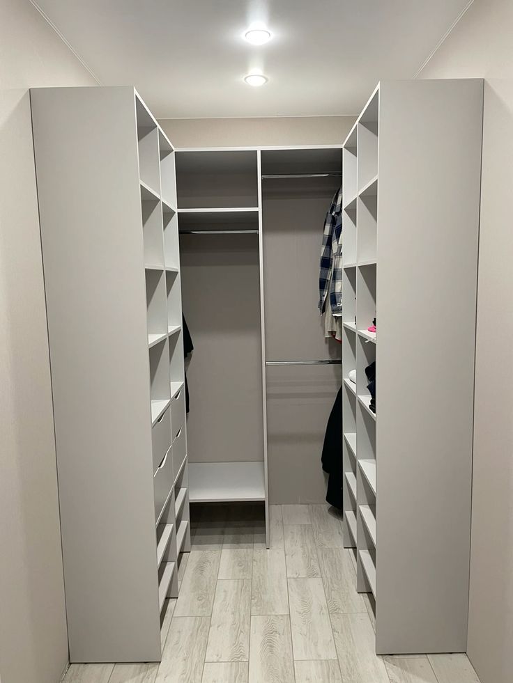 Оптимальное решение для нестандартных планировок и ниш. Такая гардеробная позволяет эффективно использовать углы, обеспечивая удобный доступ к вещам и увеличивая полезный объём хранения.