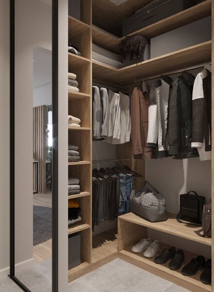 Гардеробная позволяет системно хранить одежду, обувь и аксессуары — каждая вещь находится на своём месте и всегда под рукой.